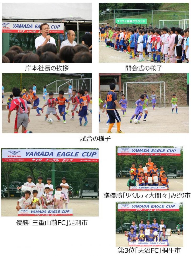2017年7月16日(日) みどり市グンエイ神梅グラウンドにて「第4回 YAMADAイーグルカップ」を開催しました。この大会は小学4年生以下を対象にしたフットサル大会で、県内外から16チーム 選手174名 サポーター165名 計339名が集まった大会となりました。当社サッカー部の審判等協力のもと白熱した試合が繰り広げられ、三重山前FCが優勝しました。
