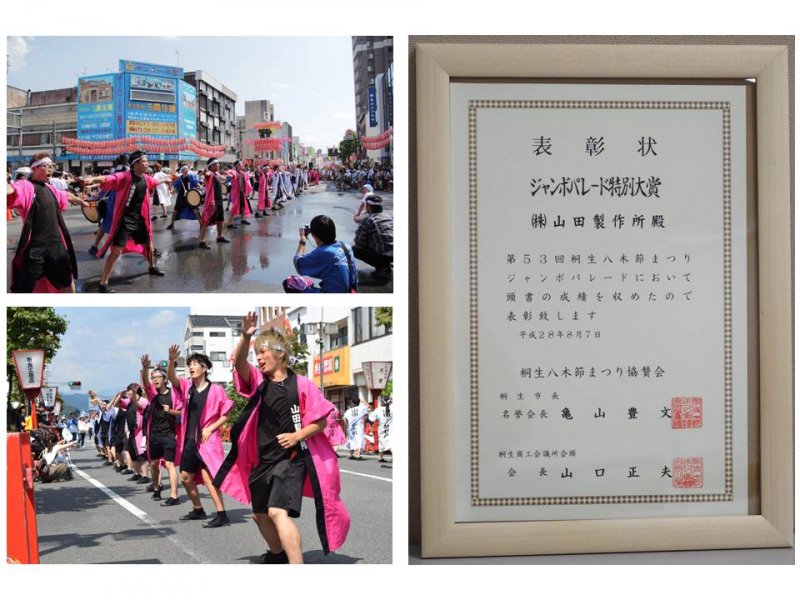 桐生八木節まつり最終日に行われたメインイベント「ジャンボパレード」に参加し若手社員が若さ溢れるパフォーマンスを披露しました。4月より練習を重ねてきた成果を本番で見事に発揮することができ、最上位の賞である「特別大賞」を13年連続で受賞することが出来ました。真夏の炎天下の中、笑顔あふれるパフォーマンスで桐生を盛り上げてくれた若手社員には、来年のジャンボパレードにも期待が集まります。